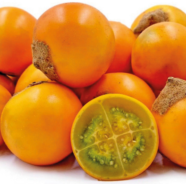 La naranjilla, también conocida como lulo, es originaria de los Andes. Su nombre científico, Solanum qui- toense, indica que proviene de Quito (la capital del Ecuador). Es una fruta de sabor ácido, muy apetecible.