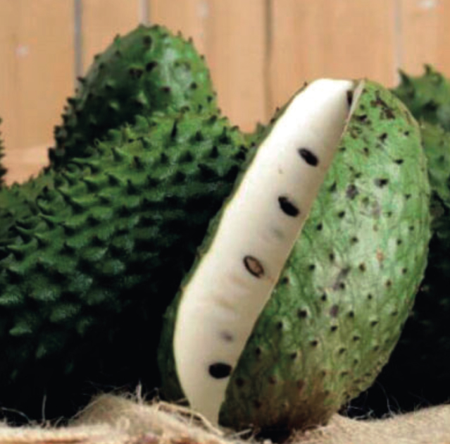 La guanábana es una fruta originaria de Sudamérica que puede llegar a medir 30 cm ¡y pesar 12 kg! Tiene un sabor ácido con notas dulces, muy estimulante al paladar.